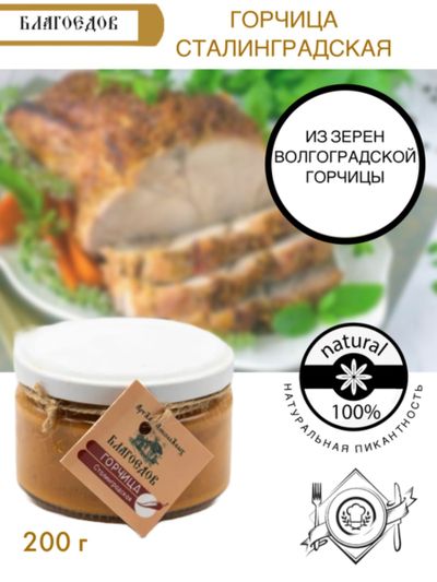 Горчица "Сталинградская" от Благоедов: вкус с характером! В каждой 200-граммовой банке – дерзкий букет, рожденный из жгучей смеси хрена и черной редьки, приправленный зерновой горчицей и согретый медовыми цветочно-ореховыми нотками.