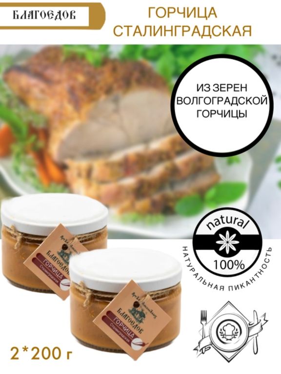 Горчица "Сталинградская" от Благоедов: вкус с характером! В каждой 200-граммовой банке – дерзкий букет, рожденный из жгучей смеси хрена и черной редьки, приправленный зерновой горчицей и согретый медовыми цветочно-ореховыми нотками.