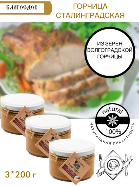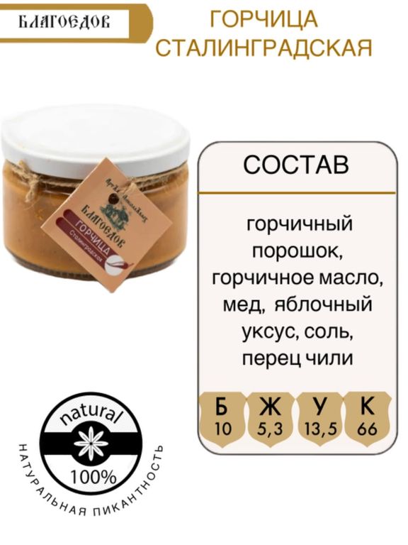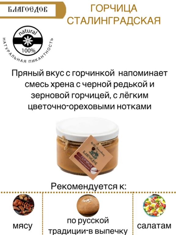 Горчица "Сталинградская" от Благоедов: вкус с характером! В каждой 200-граммовой банке – дерзкий букет, рожденный из жгучей смеси хрена и черной редьки, приправленный зерновой горчицей и согретый медовыми цветочно-ореховыми нотками.